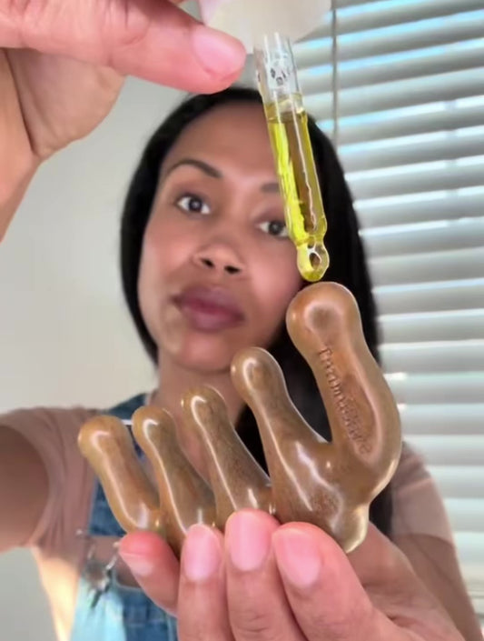 2. Aplica el tratamiento en aceite desde la raíz hasta las puntas -Distribuye y masajea con el masajeador ayurvedico de madera.