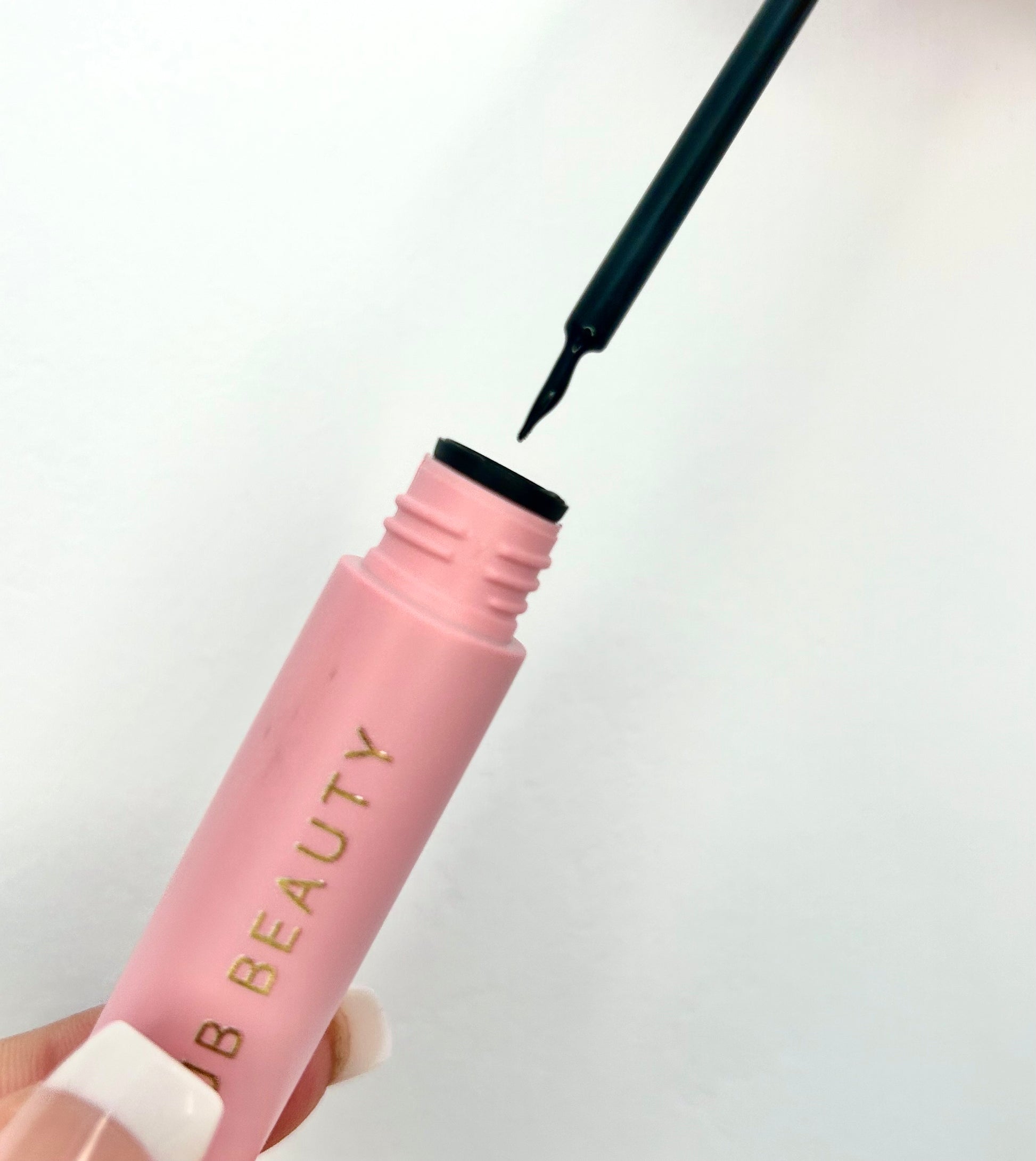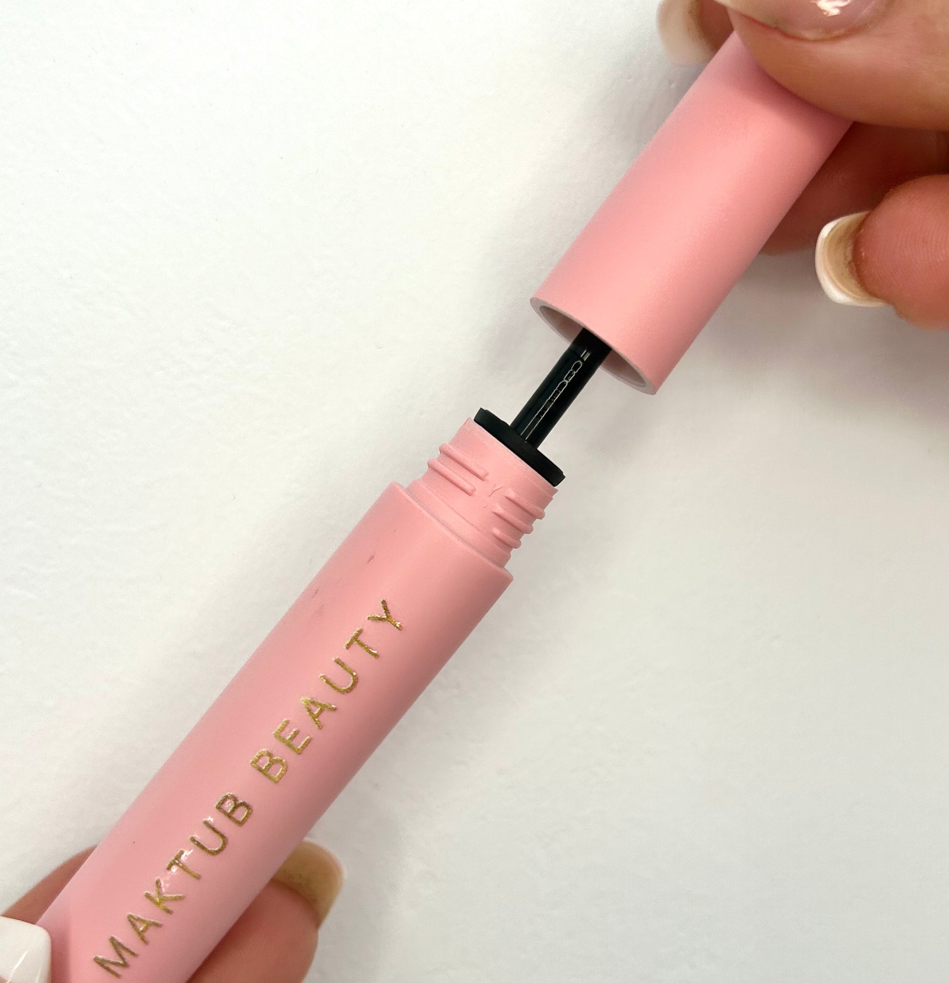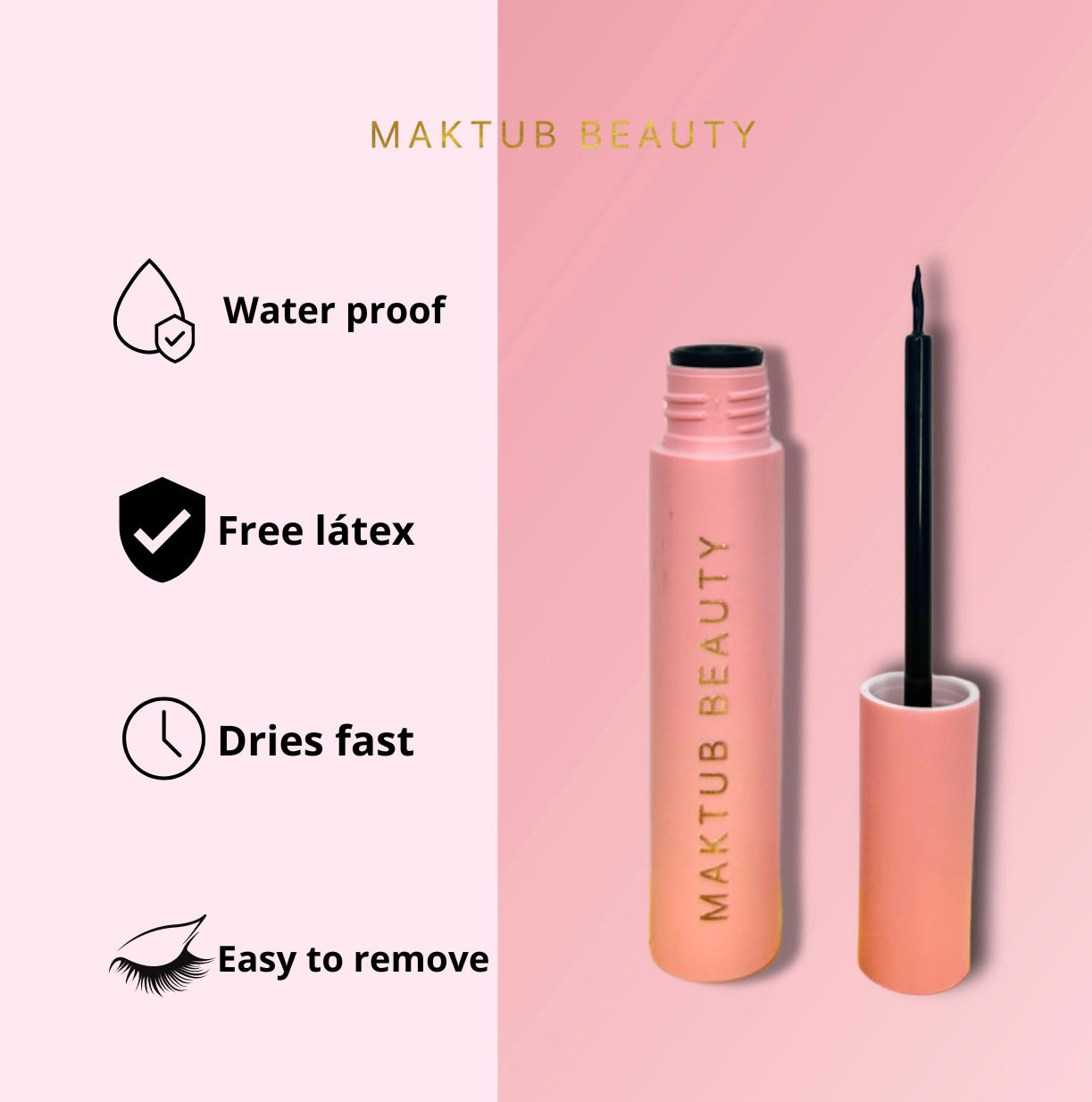 Aplica el pegamento por toda la tira de pestañas poniendo énfasis en el inicio y el extremo final para que se fijen bien sobre el párpado. Para ello puedes sujetar las pestañas con las pinzas para pestañas de Maktub Beauty, para que te sea más cómodo. Deja que el pegamento se asiente durante unos 20-30 segundos para que coja textura.