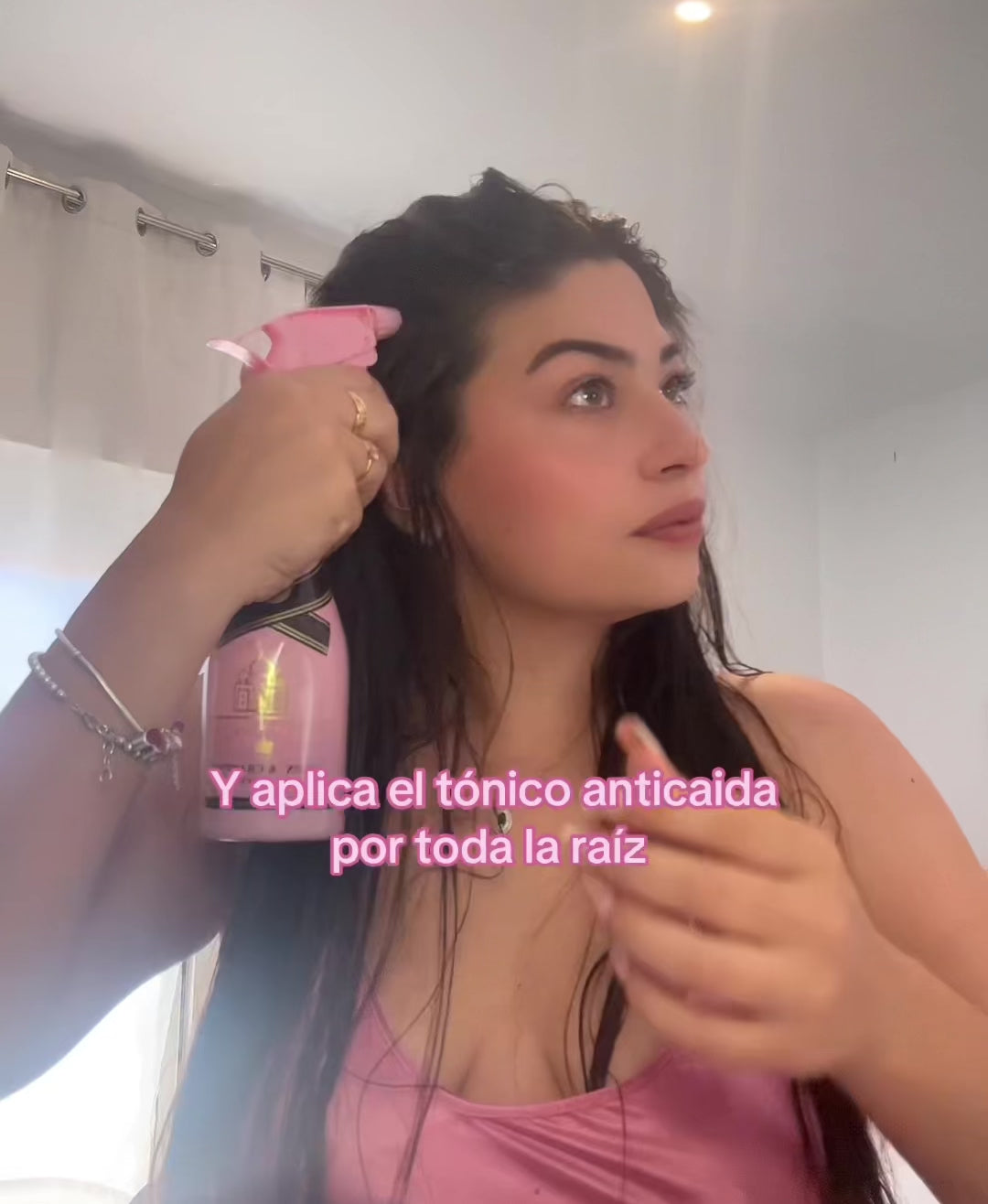 1. Con el cabello húmedo aplica el tónico anticaída, acelerador de crecimiento y volumen, sólo en la raíz. Masajea para su máxima absorción. Para unas raíces fuertes, sin caída y cabello largo.