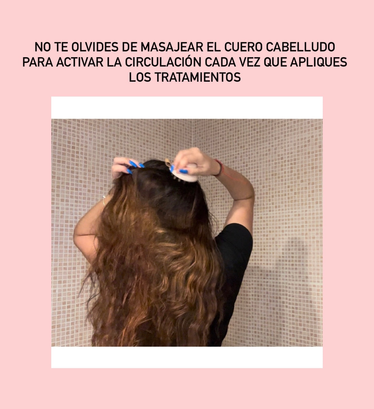 1. Aplica tu tratamiento en aceite desde el cuero cabelludo, masajeando con el masajeador para activar la circulación, para acelerar el crecimiento y el producto pueda penetrar mejor.