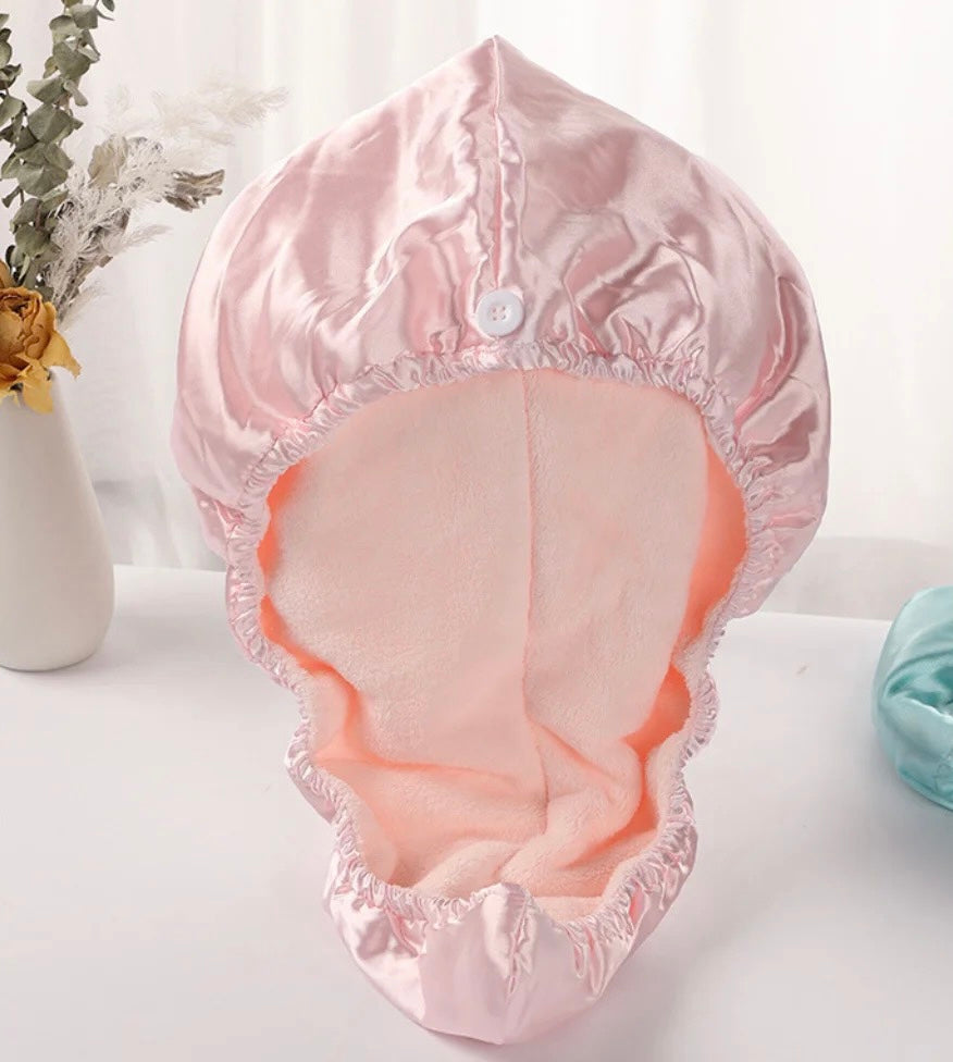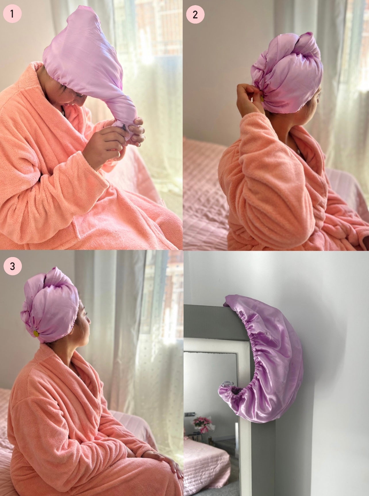 Las toallas normales pueden provocar la rotura del cabello y la electricidad estática. Seca tu pelo rápida y suavemente con la toalla de microfibra. El pelo se mantiene recogido una vez lavado utilizando la pequeña goma elástica de la parte posterior. El tejido de microfibra absorbe el agua sin resecar el pelo, por lo que se requiere menos tiempo de secado, lo que significa menos daño para el cabello.