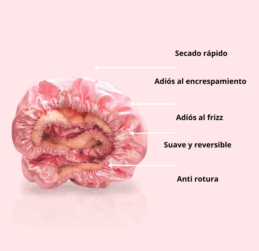 - Reversible, por el otro lado tiene una capa de satén, ideal para dormir, evitando las puntas abiertas, frizz y encrespamiento.