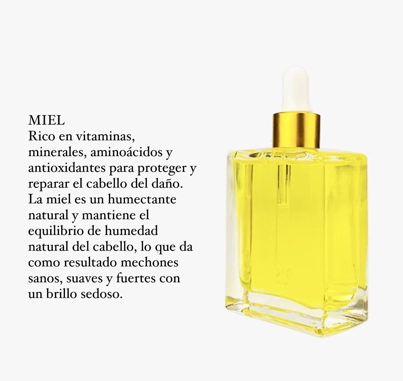 Aceite capilar infundido en miel, para aportar la máxima hidratación, brillo y suavidad.