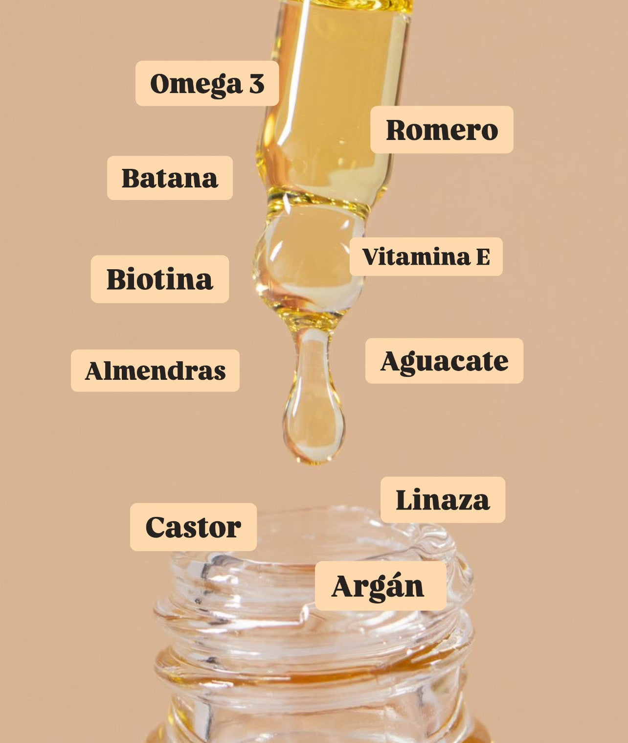 Compuesto por aceites naturales, aceites esenciales, omegas, como el omega 3 y vitaminas, E y biotina, que activan la circulación y dilatan el folículo piloso para la absorción de los ingredientes y obtener los mejores resultados de estos beneficios.